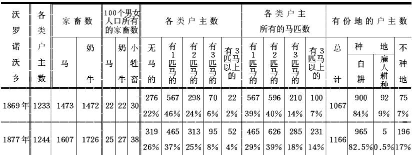 作者继续说:“这些数字雄辩地说明,该乡马、奶牛和小牲畜的总数增加了,但这种财富的增加只属于某些人,即属于有马2—3匹以上的户主……