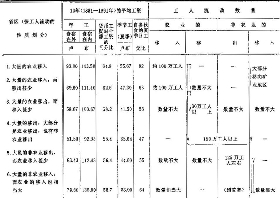(63) 其余各省均略去不计,以便不让那些对所研究的问题不能提供任何新东西的资料使叙述复杂起来;况且,这些省份不是与工人主要的、大批的流动无关(乌拉尔、北部),便是有民族学上的和行政法律上的特点(波罗的海沿岸各省、特许犹太居住区各省、白俄罗斯各省等等)。资料取自上面引证过的出版物。工资数字系各省的平均数;夏季日工工资是播种、割草、收获三个时期的平均数。这些区域(第1类——第6类)包括下列各省:(1)塔夫利达、比萨拉比亚与顿河;(2)赫尔松、叶卡捷琳诺斯拉夫、萨马拉、萨拉托夫与奥伦堡;(3)辛比尔斯克、沃罗涅日与哈尔科夫;(4)喀山、奔萨、坦波夫、梁赞、图拉、奥廖尔与库尔斯克;(5)普斯科夫、诺夫哥罗德、卡卢加、科斯特罗马、特维尔与下诺夫哥罗德;(6)圣彼得堡、莫斯科、雅罗斯拉夫尔与弗拉基米尔。
