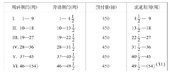 在这种场合,第一个周转期间是第1—9周,其中第一个劳动期间是第1—7周,预付700镑,第一个流通期间是第8—9周。第9周末,700镑以货币形式流回。