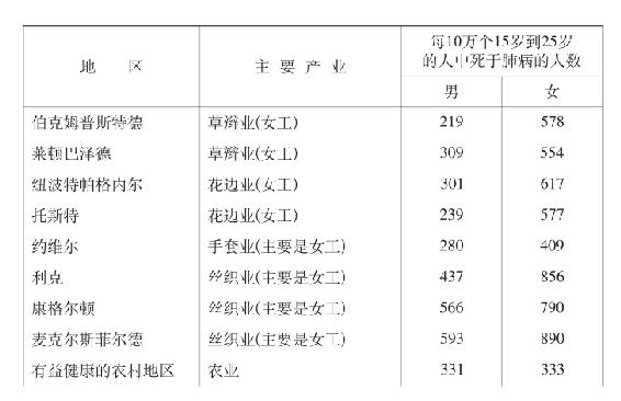 1860年和1861年卫生局调查了在室内经营的产业部门,这些部门的死亡统计表明:就同等数量的15岁到55岁的男子来说,如果在英国农业地区因肺结核和其他肺病引起的死亡数为100,在以下几个地方的死亡数是:考文垂死于肺结核的为163,布莱克本和斯基普顿167,康格尔顿和布拉德福德168,莱斯特171,利克182,麦克尔斯菲尔德184,博尔顿190,诺丁汉192,罗奇代尔193,德比198,索尔福德和阿什顿安德莱恩203,利兹218,普雷斯顿220,曼彻斯特263。(第24页)下表提供了一个更明显的例子。这个表按性别分别列出每10万个15岁到25岁的人中死于肺病的人数。表上所选择的是这样一些地区,那里只有妇女在室内经营的产业中工作,而男子却在各种劳动部门工作。