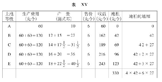 第一种情况,变例3,价格不变,但生产按加速度增长(表XV)。地租总额增加到330先令。