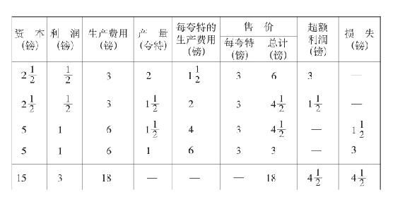 第三次投资5镑不但没有产生超额利润;它的产品1(1/2)夸特,按照一般生产价格出售,还会产生1(1/2)镑的负数。最后,第四次投资5镑的产品1夸特,按照一般生产价格出售,又会产生3镑的负数。所以,这两次投资一共产生4(1/2)镑的负数,同第一次和第二次投资产生的超额利润4(1/2)镑相等。