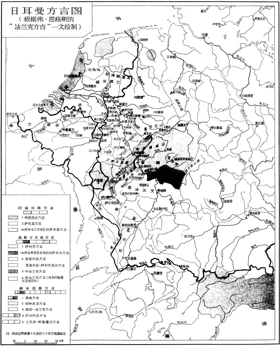 在莱茵河右岸,我们可以看到,首先在荷兰,莱茵河畔有Wageningen,艾塞耳河畔有Genderingen(在这里,我们将一切可能是弗里西安的名称除去);在贝尔格地区有Huckingen,Ratingen,Ehingen(紧接着,在萨克森的领土上,有Hattingen,Sodingen,Ummingen),韦尔登附近有Heisingen(格林认为这来自塔西佗的Silva Caesia[凯西亚森林],可见已很古远),Solingen,Husingen,Leichlingen(在分区图上则为Leigelingon,可见已有上千年之久),Quettingen以及济克河畔的Bödingen和Röcklingen,另有两个以ing为词尾的地名尚未计算在内。莱茵布罗耳的Hönningen以及维德河一带的Ellingen,构成了同莱茵河、兰河、迪耳河各地之间的联系,在这里,至少也有12个ingen。再往南去找就没有意义了,因为阿勒曼尼人确曾移住过一个时刻的地方,已经从这里开始了。