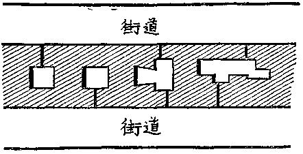 后来出现了另一种建筑形式,这种形式现在已普遍地采用了。现在,工人小宅子几乎再也不一所所地盖了,总是一盖就是几十所,甚至几百所;一个业主一下子就盖它一整条或两三条街。这些街道排列如下:第一排是比较高级的小宅子,很幸运,这些小宅子有一个后门和一个小院子,因而房租也最贵。这些小宅子的院子通向一条两端都盖有房子的弄堂(back-street),其中一端有一条窄缝或有顶的过道通到这条弄堂里去。大门开在弄堂里的那些小宅子,房租最便宜,一般也照管得最坏。它们和第三排小宅子共用一堵后墙,第三排小宅子的门开在另一条街上,房租比第一排便宜,但比第二排贵。这样,街道的布置情况就约略如下图: