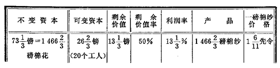 假定:花费资本100(不变资本和可变资本),由这笔资本推动的劳动提供等于预付总资本1/5的剩余劳动(无酬劳动),或者说,提供等于100/5的剩余价值。因此,如果预付资本等于100镑,总产品的价值就应该等于120镑。再假定平均利润等于10%;在这种场合,110镑就是总产品(在上例中是煤)的费用价格。100镑的资本,不管开采的是富矿还是贫矿,在剩余价值率或剩余劳动率既定时转化为120镑的价值;总之,劳动的不同生产率,不论它是劳动的不同自然条件的后果,还是劳动的不同社会条件的后果,还是不同技术条件的后果,都丝毫不会改变商品价值等于物化在商品中的劳动量这一论点。