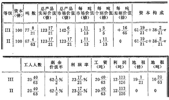 至于Ⅱ,这里产品的[实际]价值也等于120镑等等。但是因为每吨个别价值等于1+(11/13)镑(或24/13镑),所以这个等级生产65吨(因为120除以24/13等于65)。简单地说,我们在这里得到的是第574页上的A表。但是因为在这里我们需要有几个新项目来适应我们的目的,所以当出现Ⅰ这个等级而产品市场价值提高到2镑时,我们就要为这第三种场合制一个新表。