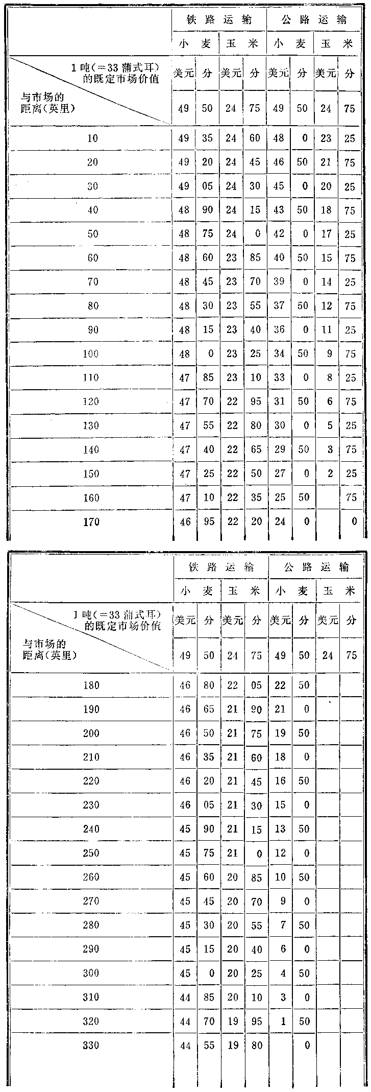 (31) 科贝特1841年计算了在9个月的季节里保存小麦的费用:它的数量的损失是1/2%,3%是小麦价格利息的费用,2%是仓库的租金,1%是风净和运输费,1/2%是运送的劳动,总计是7%,或者说,在小麦价格为50先令的时候,每夸特花费3先令6便士。(托·柯贝特《个人致富的原因和方法的研究;或贸易和投机原理的解释》1841年伦敦版[第140页])。根据利物浦的商人向皇家委员会提供的证词,1865年利物浦保存粮食的费用是每月每夸特2先令,或每吨9至10先令。(《皇家铁道委员会。证词记录》1867年伦敦版第331号第19页)