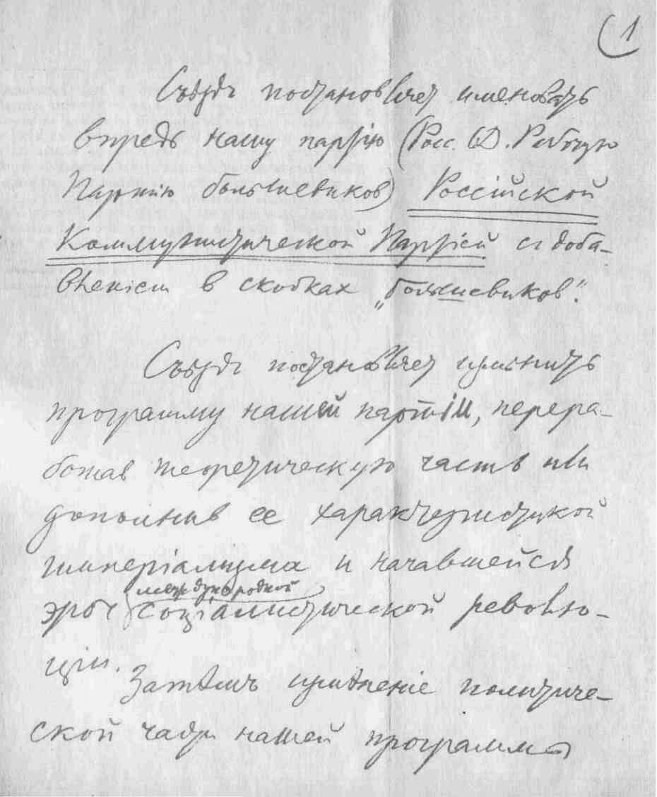Первая страница рукописи В. И. Ленина «Резолюция об изменении названия партии и партийной программы». - Март 1918 г.